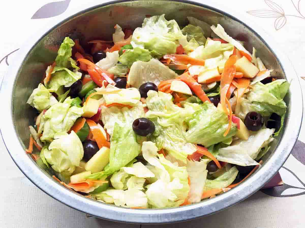 In a large salad bowl, add half of the quantity of the following items : lettuce, cucumbers, tomatoes, whole olives, onion slivers, carrots, apple, raisins, cheese and walnuts pieces.