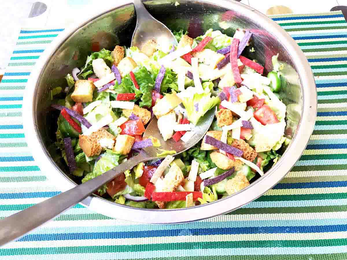 Pour ¼ cup of Vegan Caesar Salad Dressing on tops of the salad contents. Toss the salad contents thoroughly.
