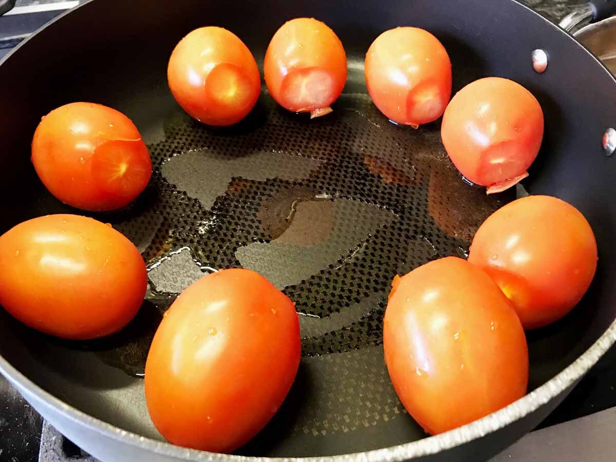 Using a sharp knife, cut off a thin slice at the stem area of the tomatoes and discard them. Place the tomatoes in a large fry pan with enough depth to hold them.