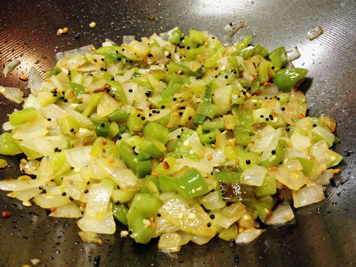 5. Add the bell pepper, onion and half a teaspoon salt. Stir fry and cook until the vegetables appear glazed and soft.