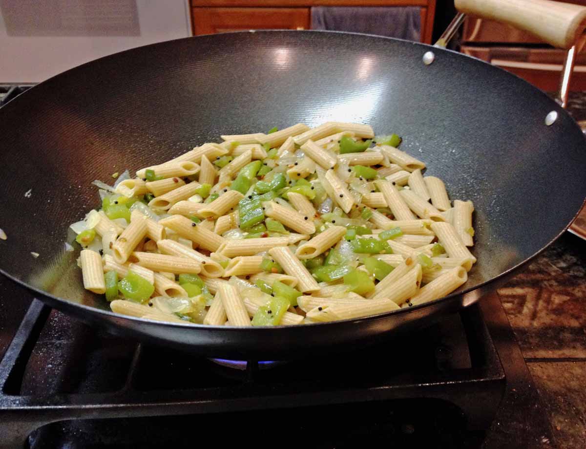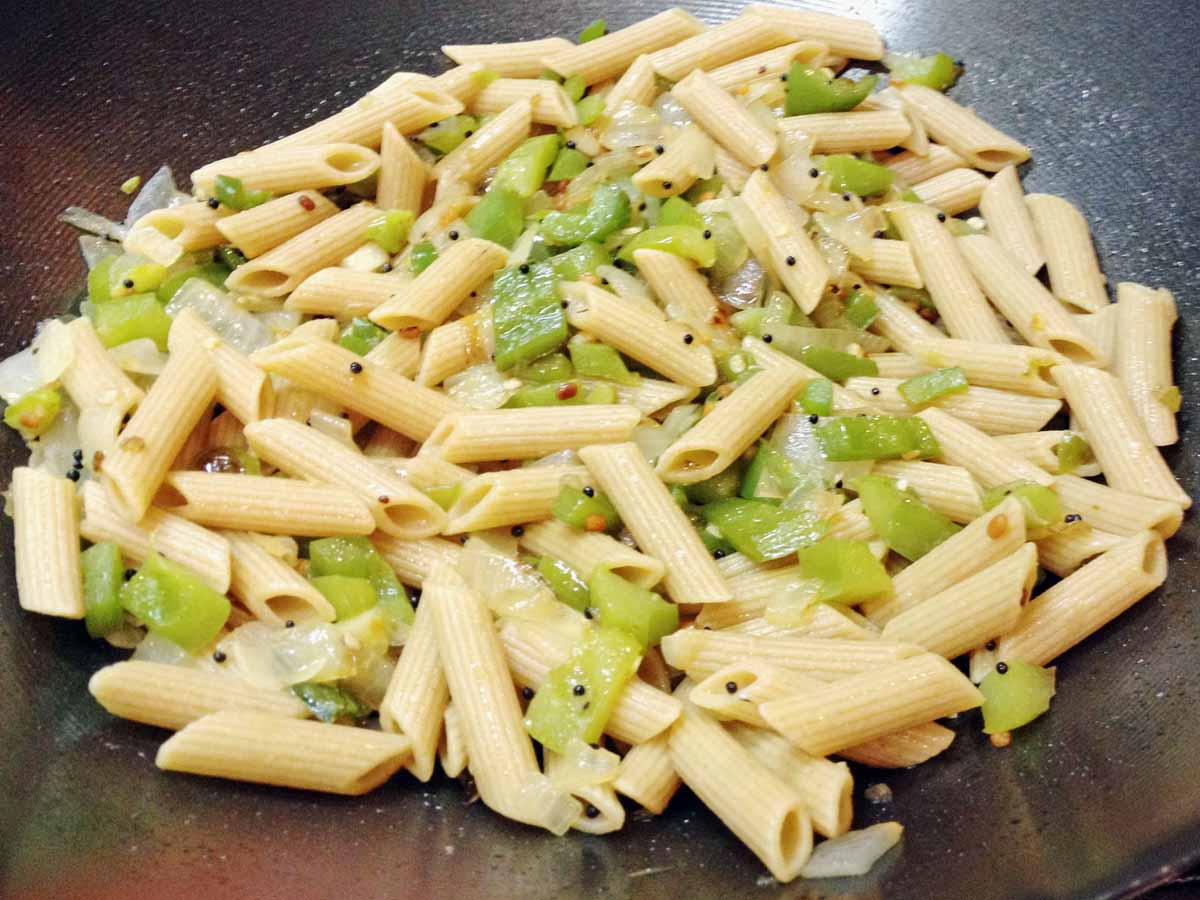 6. Add the cooked penne pasta to the cooked vegetables. Mix.