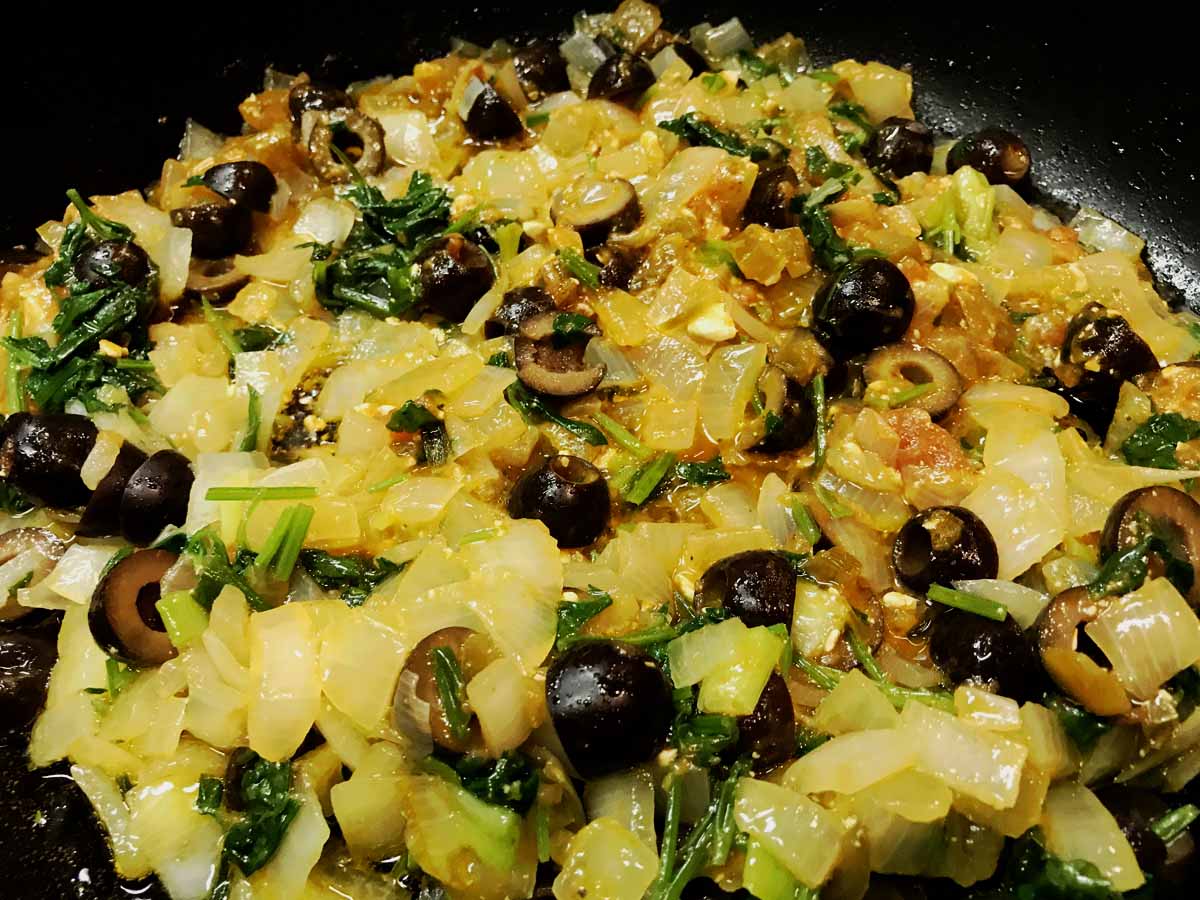 Add 1 cup sauce, olives and fresh basil. If you like it tangy, add 1 more cup of sauce. Mix well and cook for 1 minute.