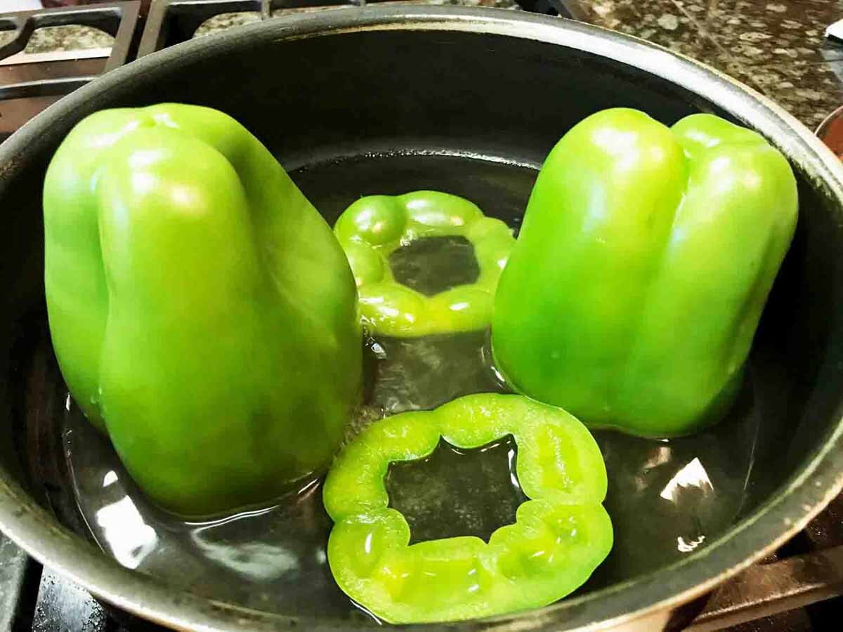 Place 2 cups of water in a deep pan or a Wok, with room enough to hold 2 bell peppers standing. The water should cover about 1/2 to 1 inch of the bell peppers at the bottom.