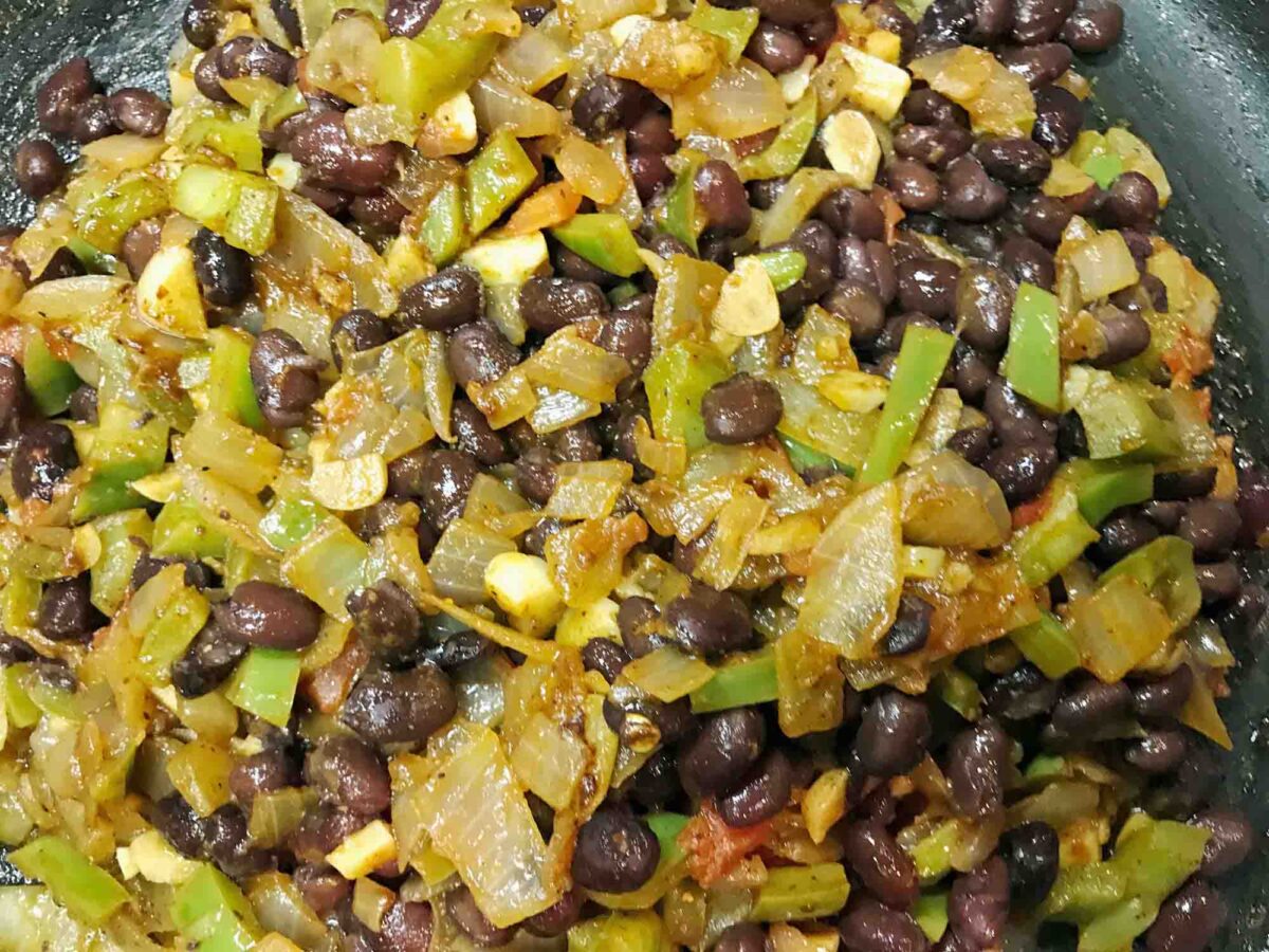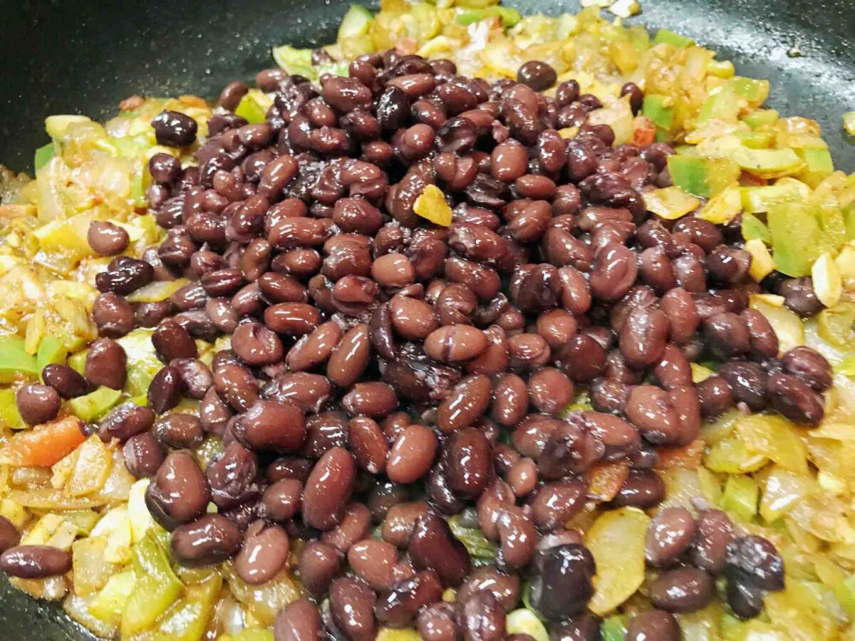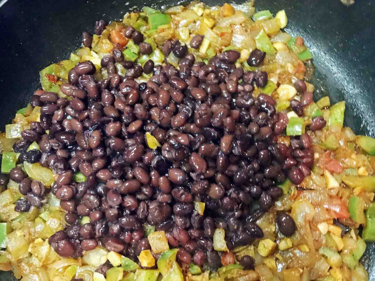 Drain the black beans. Add the black beans, cilantro and 1/2 teaspoon salt to the frypan with the veggies mixture.