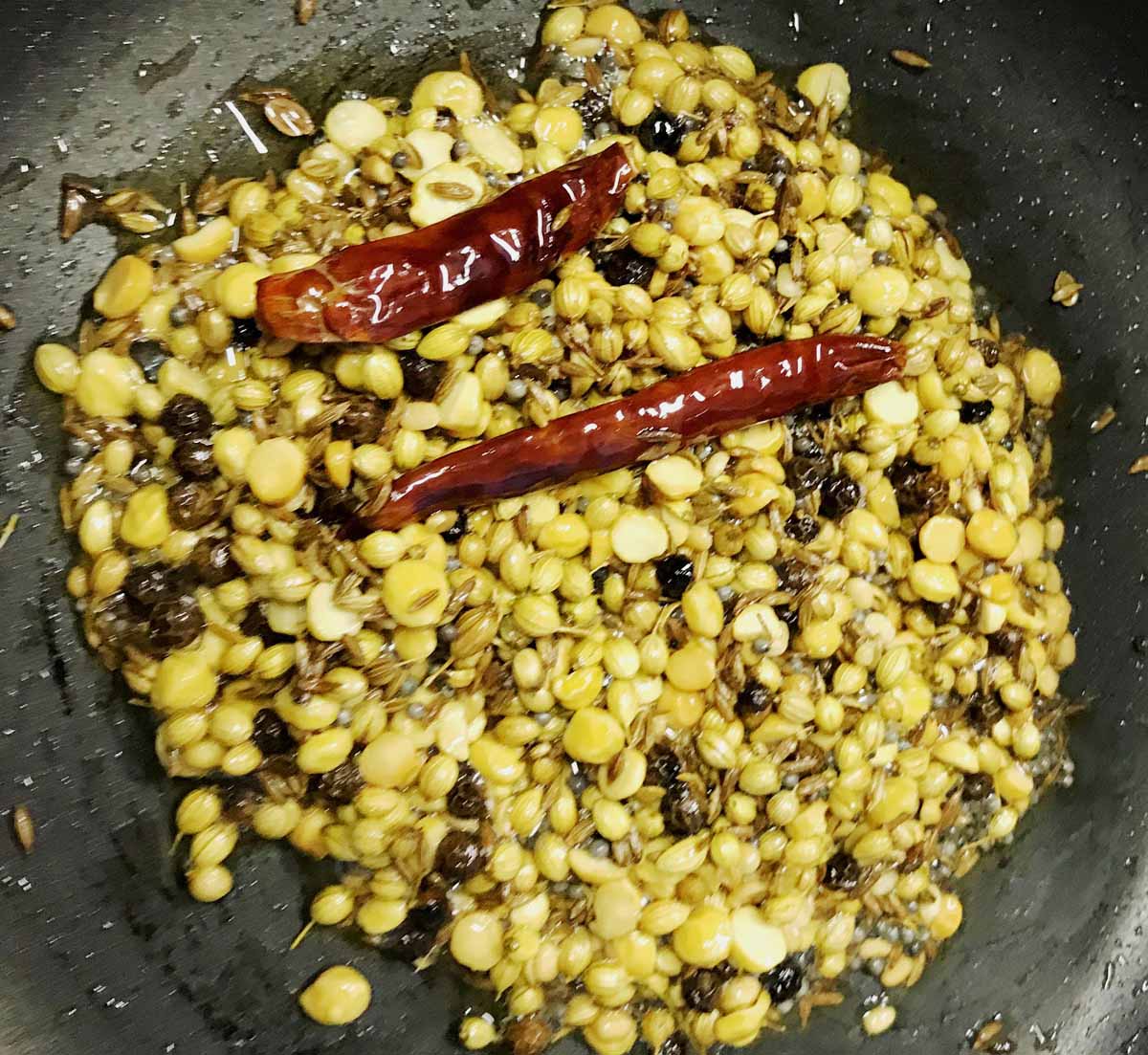 Place a sauce pan on medium heat. Add 1 teaspoon oil. When oil is hot, add the channa dahl, urad dahl, red chillies, black peppercorns and coriander seeds to the pan. Stir fry with a flat spatula until the channa dahl and urad dahl turn golden brown or slightly roasted. Do not fry too much. Add the cumin seeds and stir-fry for 10 seconds.