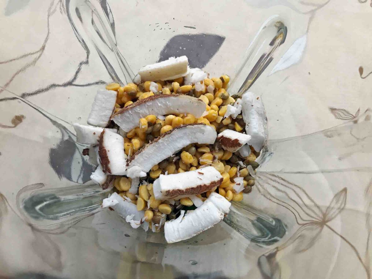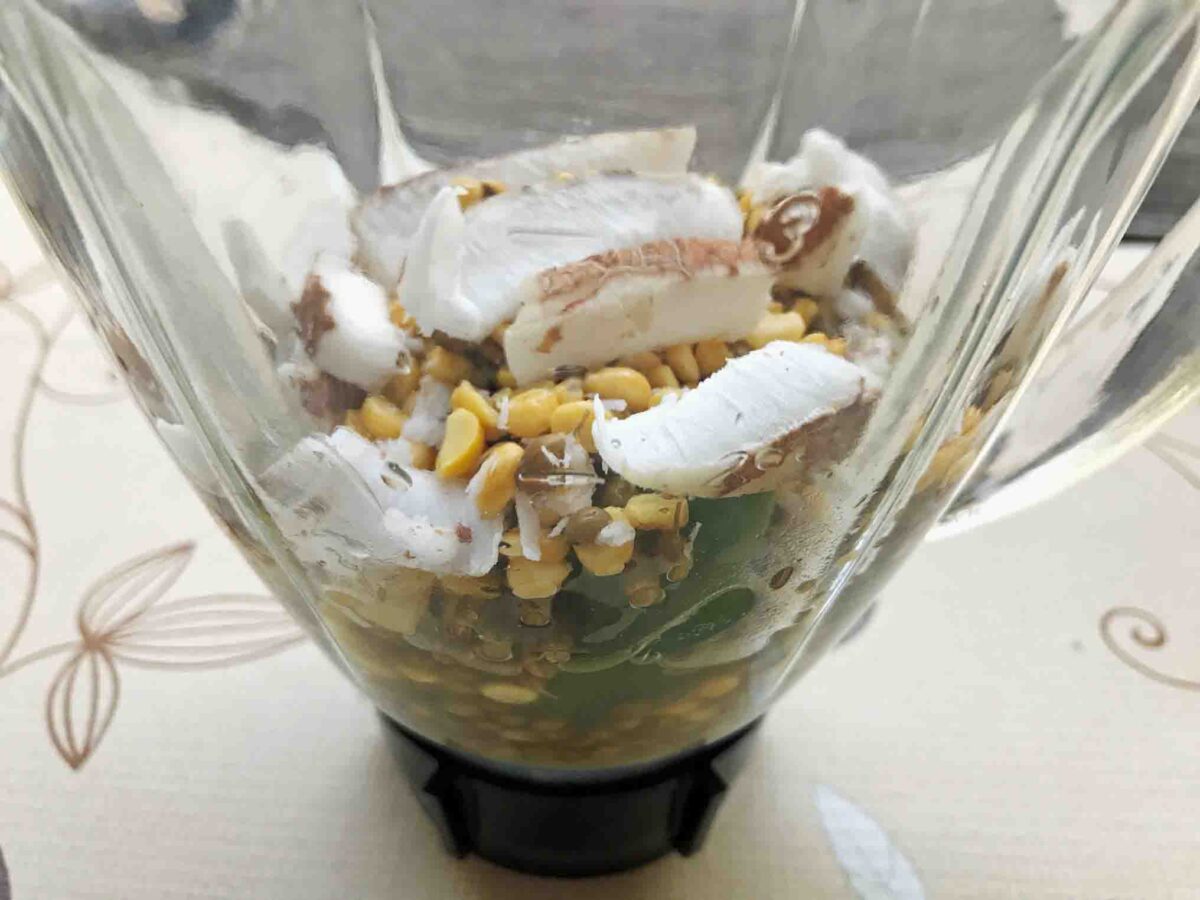 Soak the coriander seeds, channa dahl and cumin seeds in a small bowl with a cup of water, for about 10 minutes. Drain. Soak and Blend the Coconut/Spices Mixture.
