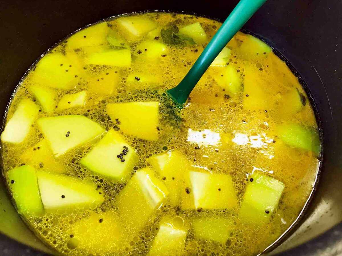 Cover partially, and cook for about 8 to 10 minutes, or until the squash is cooked well, but firm. Add water if necessary, 1/4 cup at a time. Squash cooks easily. Do not overcook. Use a toothpick from time to time to check if the squash is cooked.