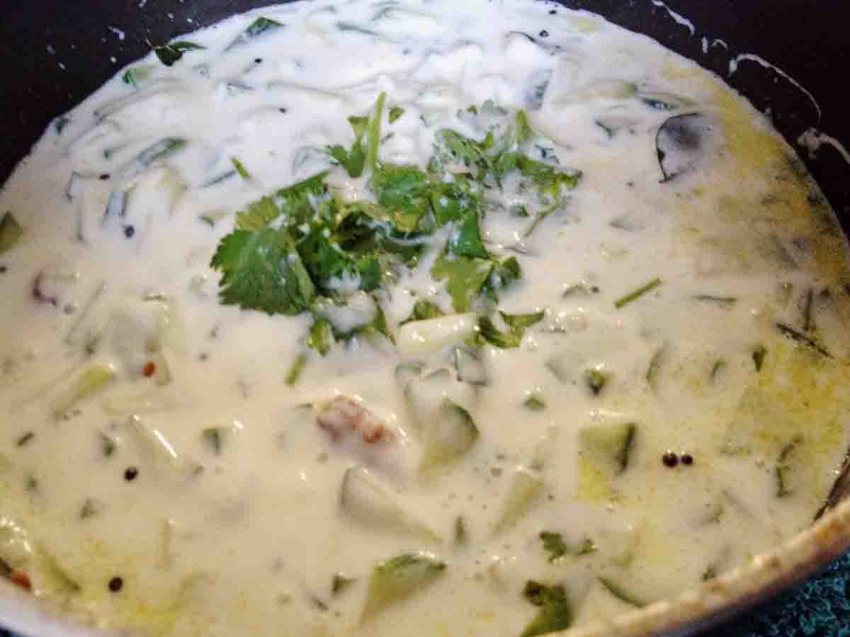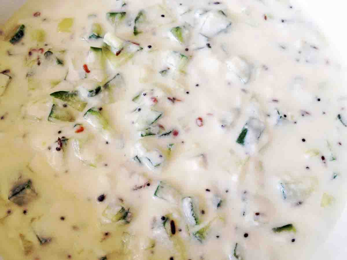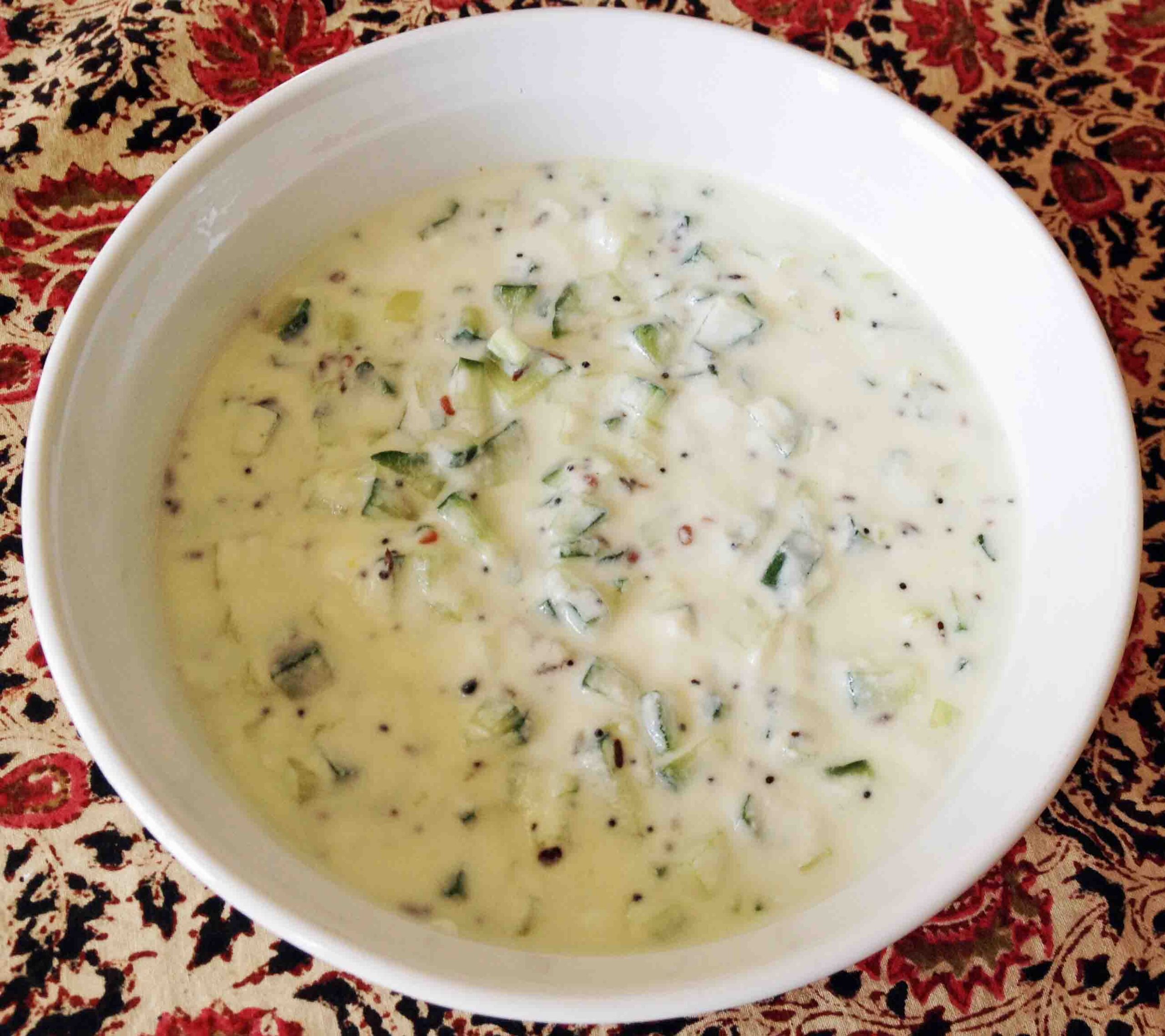 Cucumber Raita called “Pacchadi” in South India, is really a refreshing side dish. It is made with plain yoghurt, so it is cool, healthy, has a lot of protein and is very yummy. I call yoghurt “The Equalizer” because it does just that when you eat spicy and hot dishes. It equalizes not only your taste buds that are scorching from heat or revolted by other strange tastes, but it also equalizes the digestive system within. I am really glad that I can use it every day in some way or the other. I am lucky and I want you to be too!