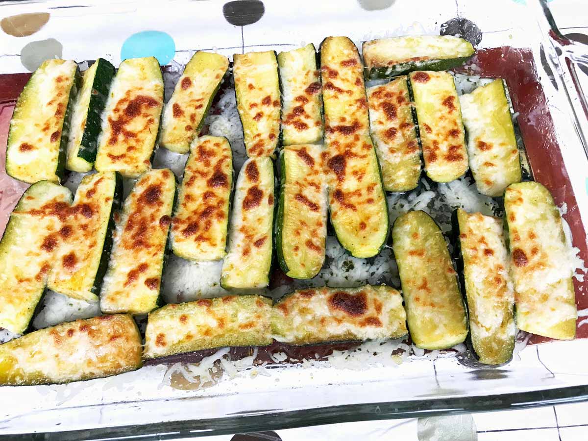 Check after every minute. When the zucchini tops are broiled to golden brown, switch off the oven. Immediately remove the casserole dish to the counter top or table top.